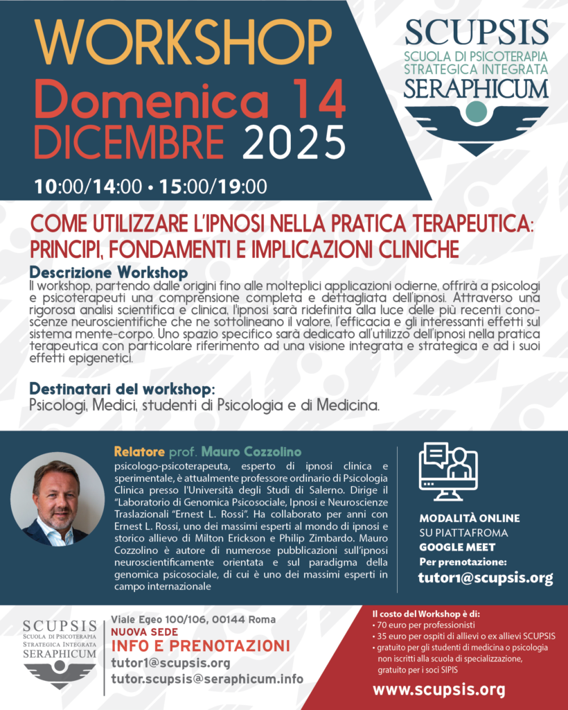 Siamo lieti di invitarvi al nuovo workshop organizzato da SCUPSIS (Scuola di Psicoterapia Strategica Integrata Seraphicum), un’occasione imperdibile per approfondire l’uso dell’ipnosi in ambito clinico.